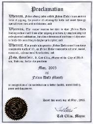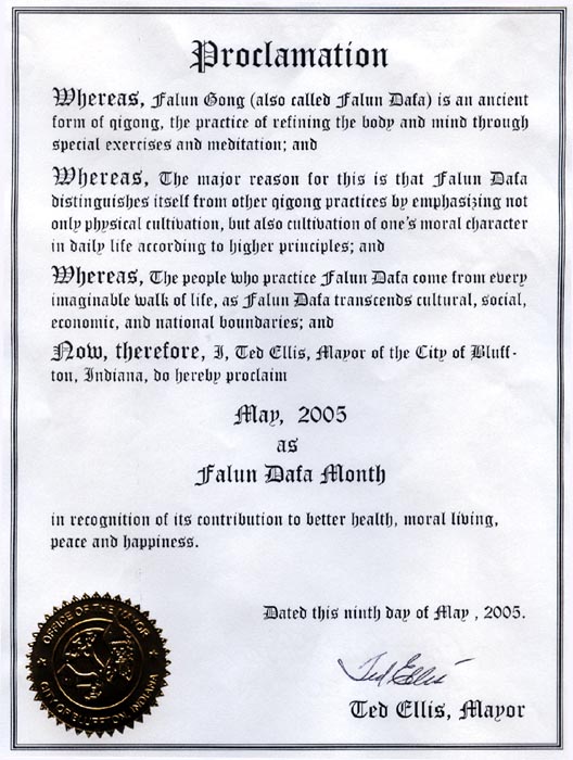 以表彰法轮功对增進健康、有道德的生活,以及和平与快乐方面所作出的贡献。