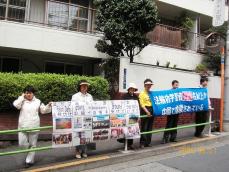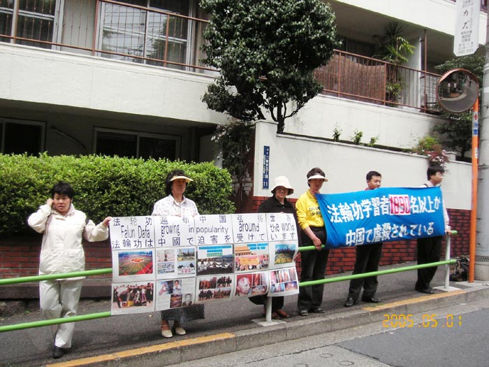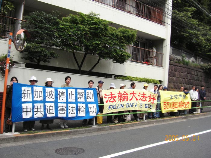 新加坡法庭的不公正判决,引起全世界法轮功学员和社会各界的极大关注。5月1日上午10时开始,几十名日本法轮功学员来到新加坡大使馆对面的街道上,打出“新加坡:不要做中共迫害法轮功的帮凶”、“新加坡停止帮助中共迫害法轮功”、“法轮大法好”,“1890名以上法轮功学员在中国被虐杀”等字样的横幅和介绍法轮功洪传世界及中共迫害法轮功的图片。