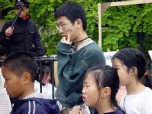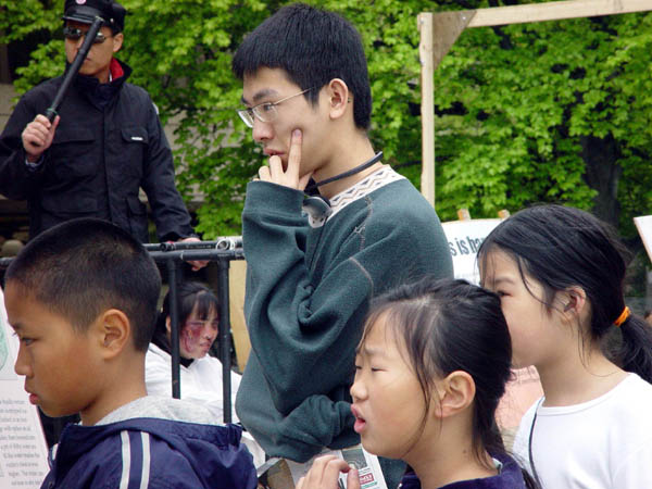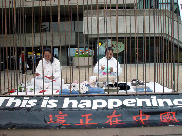大型铁笼中两名身穿囚服,脸部被化妆成青一块紫一块、伤痕累累的女士正在不停的缝补和整理各种出口产品如玩具、服装和卫生筷等,这就是模拟酷刑展的一角。“追查迫害法轮功国际组织”赶制了八幅巨型展板向人们展示已倾销到国外,在中国劳教所强迫法轮功学员生产的各种产品,并配有图片及说明。与会者为模拟酷刑展所震撼,很多人表示虽然知道中国存在奴役劳工现象,却不知有如此严重,并用以迫害信仰团体-法轮功。