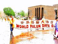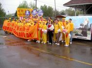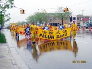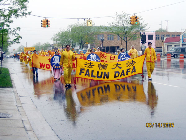 一百多个参加队伍 ,花车精美 ,服饰华丽;具东方传统的法轮功学员队伍在其中气宇轩昂 ,非常醒目。密西根法轮功学员除了提供花车与法轮大法功法演示外,还组织了一支包含有中、外、男、女、老、少等约三十人的腰鼓队,清脆响亮的鼓声,合着“法轮大法好”的音乐,带给观众清新的心灵感受,老老少少的观众也自然的挥手致意或向法轮功学员报以会心的微笑。