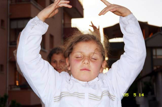 约20个新小弟子在炼功后向师父问好