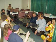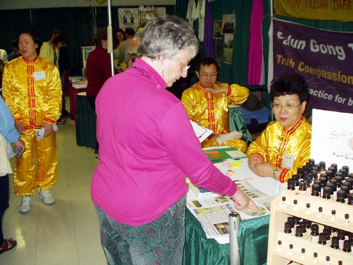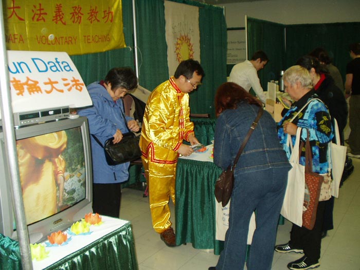 在两天的展会中,法轮功的展位是本次展会的亮点,来参观我们展位的人数最多。展位上,我们播放法轮功法演示录像并当场教功,还教前来参观的人叠纸莲花。第一天,我们到会场开始布置时就已经有人在等着要学功,展会期间来学功的人更是络绎不绝,甚至展会闭幕时,还有人不愿走要跟我们学功。
