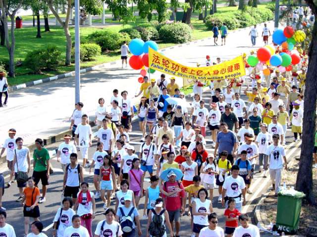 在这一天,新加坡法轮功学员意气风发的出现在浩浩荡荡的人流之中。他们身着黄衫,衣服上印着“法轮大法”或“真善忍”的中、英文字样,手擎大束彩色气球,高举着黄底红字的横幅,上写:“法轮大法好”、“法轮功使上亿人身心健康”、“法轮功传遍世界78个国家地区”。走在最前面的是法轮功学员的腰鼓队。几十名大法弟子英姿焕发,鼓声响亮整齐,步伐有力坚定。大法弟子的队伍色彩绚丽、神采奕奕,分外引人注目。好几位摄影记者一会儿站到高处、一会儿又蹲下忙着抢镜头,还有路人为他们鼓掌加油。