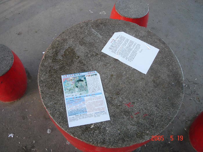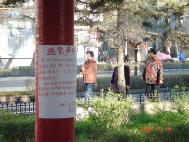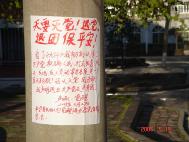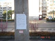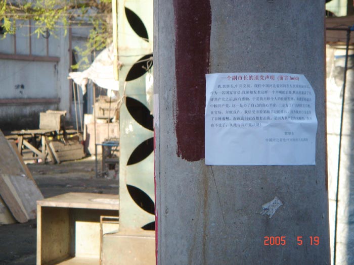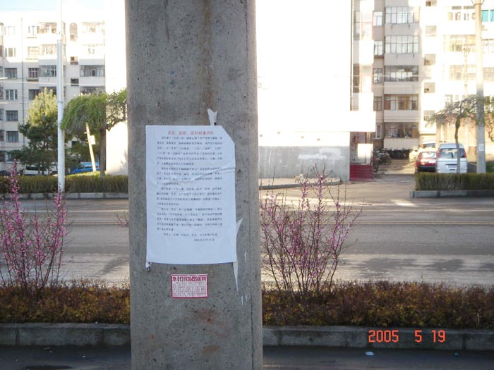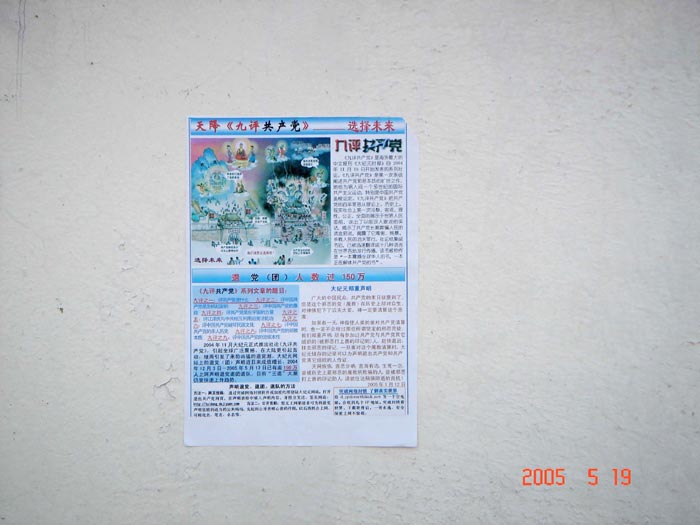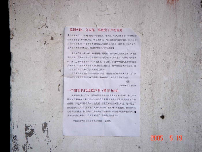 (1)在街道两边的电线杆上,一张用红色彩笔手写的“退!党!、退*团-声明”非常醒目。标题为“天要灭党!退!党!、退*团-保平安!”;内容为“我看了《·九·评*》彻底认清了共产党欺骗人民、打击良善、反天、反地、反人类的罪恶本质,是一个真正的邪教!我以入党、入团为耻!我郑重宣布退出共产党及共青团。声明人:觉醒 2005年2月27日。希望更多善良的人觉醒,退出恶党保平安。”并留下签名空白位置。