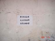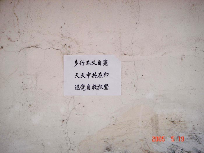 (7)在家属区附近一墙山贴着大字标语:“多行不义自毙,天灭中共在即,退!党!自救抓紧。”