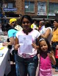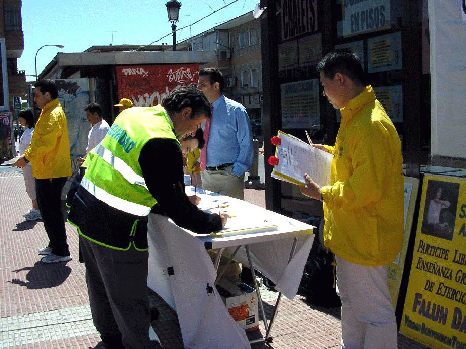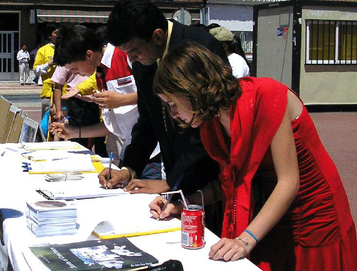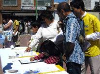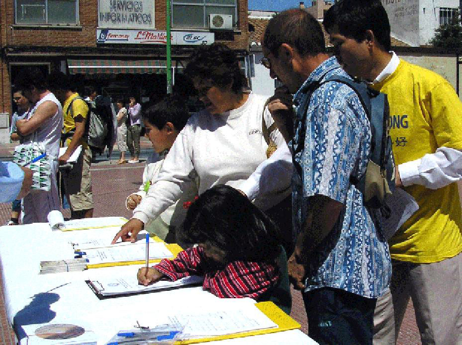 一位淳朴的妇女看了图片后,立刻找到学员问怎样能帮助中国的法轮功学员。当听说可以签字支持时,她向学员要了好几张表格说,她的家就在火车站附近,她要把表格拿回去让她的家人和邻居都签字。不多时,这位女士拿着填满了名字的表格回来了,她告诉学员说,她的全家和所有的邻居共40多人都在上面签了字。