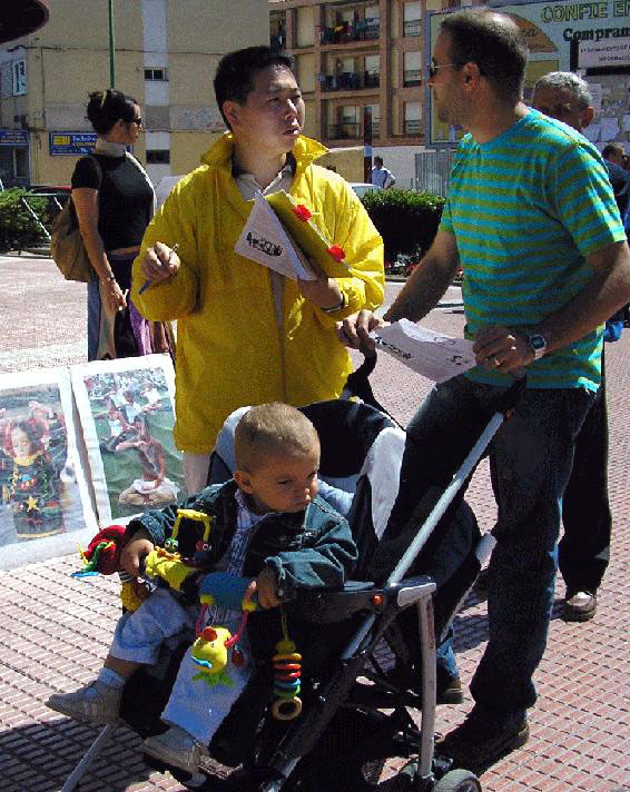 我们的活动是在火车站门口的空场上。从活动一开始,火车站门口的两位保安就一直在远远的注视着。学员走过去将传单递给他们。不知什么时候,他们也出现在签字桌前认真的在表格上签了自己的名字。一位保安说:按照规定,他们在值勤时是不能参与和介入工作以外的任何活动的,但是他认为作为一个人,不能面对这种灭绝人性的屠杀保持沉默,他有责任尽自己一份心力呼吁停止迫害。