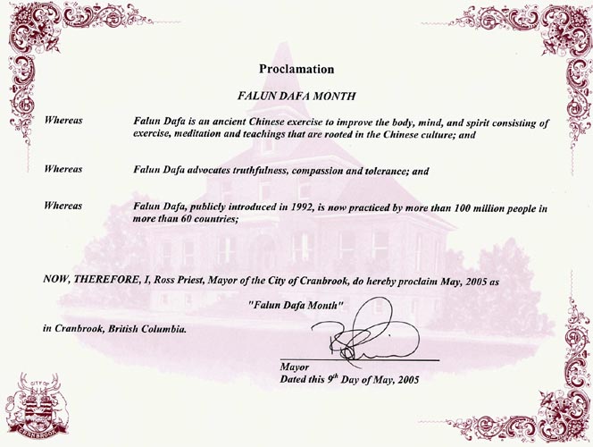 鉴此,我,罗斯•普莱斯特(Ross Priest),克兰布鲁克市市长,特此褒奖2005年5月为