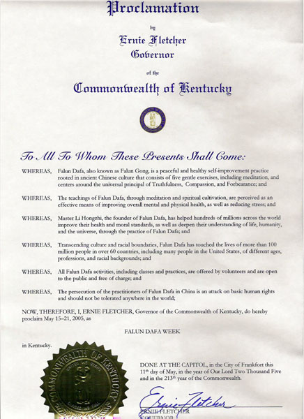 因此,现在,我,肯塔基州州长厄尼•弗莱切尔(Ernie Fletcher)褒奖2005年5月15日至21日为