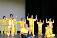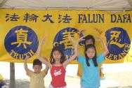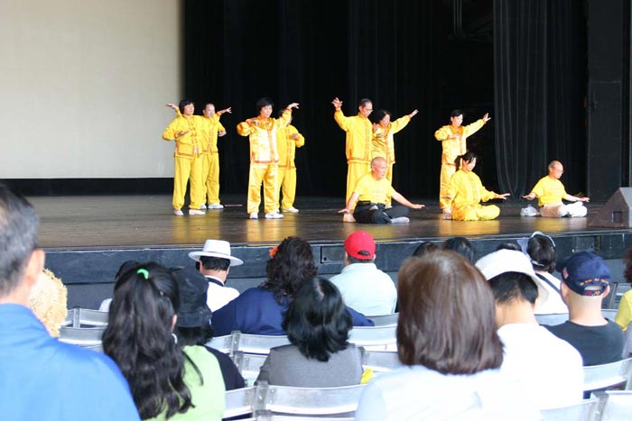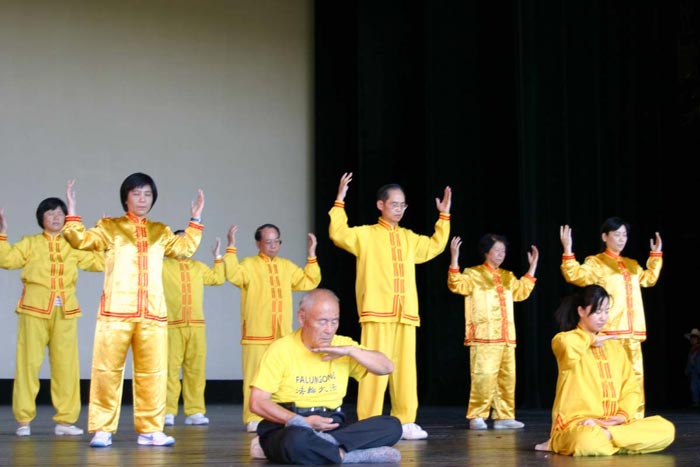 在户外剧场上,各族裔表演节目,当法轮功学员的功法将要展示时,APAHA主办人走向前台,热情的向观众介绍法轮功。法轮功学员的功法展示更加吸引了市民,观众的掌声久久不断,一位西方男士用力的鼓掌,一边自言自语的说:“法轮功好,法轮功好。”他对法轮功学员说:“周末,我将去公园学炼法轮功。”紧接着,法轮功学员表演唐装舞,也同样深受欢迎。