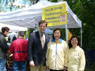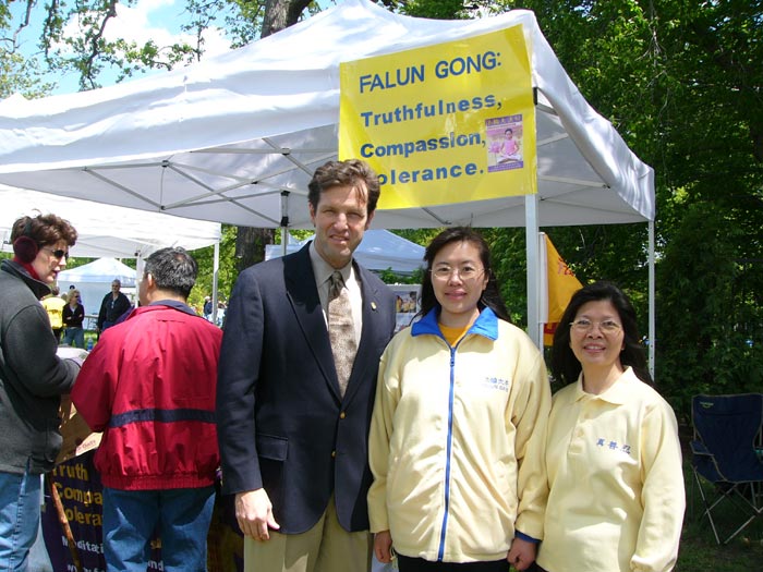 来学功的人络绎不绝这个美好的愿望显然得到了实现。一整天,来法轮功学员展位的人都不断,人们表达了对发生在中国的残酷迫害的关心,很多人详细询问如何学炼法轮功。来地球日活动参观的国会议员Carnahan先生也高兴的与法轮功学员合影。当场学功的人更是络绎不绝。其中一位先生是学校的老师,他说他在学第二套功法时,感受到自己的思想更加开阔并有更多的善念。他不仅自己学了全部五套功法,还希望与学员联系,把法轮功介绍给他学校的学生。