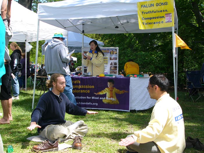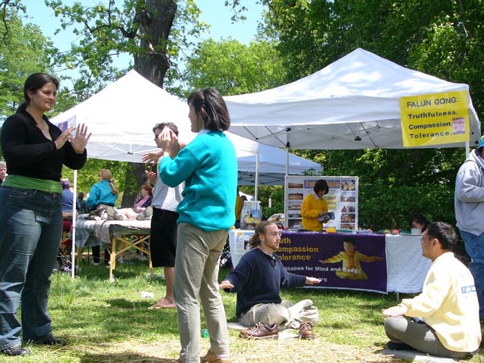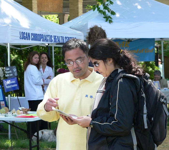 【明慧网2005年5月3日】(明慧记者彭玉圣路易报道)碧空如洗,绿草茵茵,五月初的圣路易森林公园(Forest Park)风景如画。春日温馨的阳光下,来自印度的软件工程师Vasudha微笑着向过往的游人分发法轮功的介绍资料,旁边的展台后,她的先生Satya正祥和的演示法轮功五套功法。他们五个月大的女儿安静的躺在旁边的婴儿车里,好奇的看着周围热闹的场面。其他几位法轮功学员在分发资料、与人们交谈、教功之余,也不时过来照看一下可爱的小宝宝。这是当地法轮功学员第四次参加圣路易一年一度的地球日(Earth Day)活动。