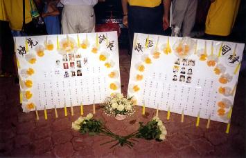 ![]() 这是被警方强行没收的两块展板,板上印有被迫害致死的107名中国学员的名单和他们的照片。左边板上写有“烛光晚会”,右边板上写有“悼念同修”。 |
