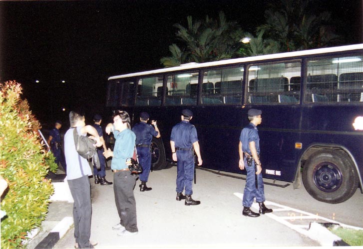 在整个过程中,三辆大型警车、多辆小型警车陆续到达。经过几个小时的对话无果后,警方采取行动强行没收两块板子并拘捕15名学员。其后15名学员被控上法庭,7人被判入狱一个月,8人被罚款1000新币。