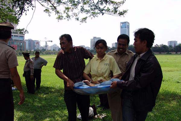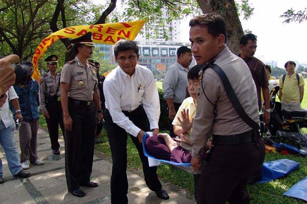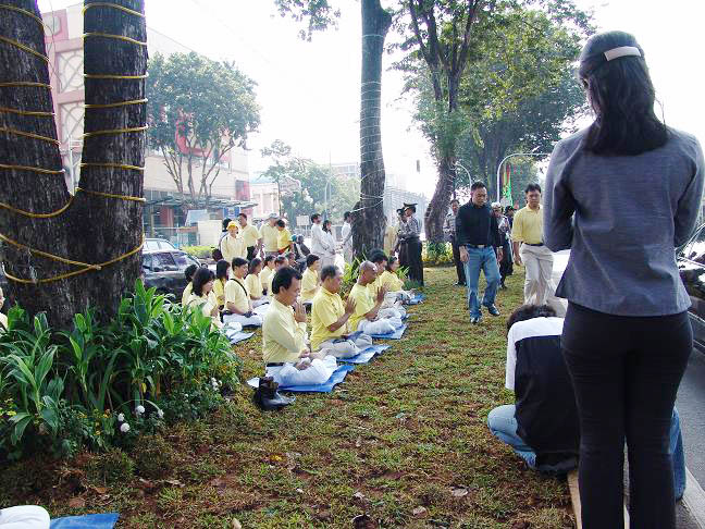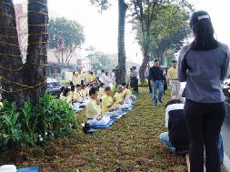 2005年4月23日和25日,印尼法轮功学员分别举办了两次请愿静坐活动。第一次是在亚非高峰会议大厦前面,第二次是在中国驻印尼大使馆前面打“真善忍”和“全球公审江泽民”等横幅,演示酷刑以揭露中共对法轮功的迫害,并进行集体炼功。两次活动都很快被警方强行撤散,有12名法轮功学员被扣留24小时录口供。在雅加达南区初级法院,12名法轮功学员最初被告的理由是违反基本法令第510号的“干扰公众秩序”,后来法官按照警方改成的违反1988年第11条地方条例“占用绿化地带空地”为由定罪,并于28日上午在所有被告缺席的情况下,将12名法轮功学员自行判决,待候监禁2个月和试验期6个月。(即,在未来的6个月中不得再去同样地点请愿,如有违反,则监禁2个月。)