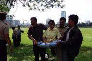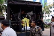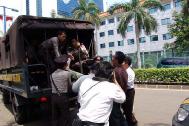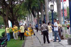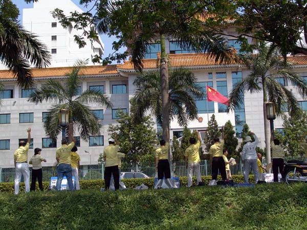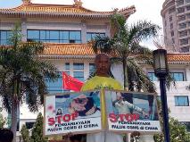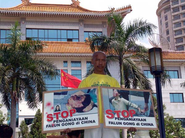 ![]() 学员手持“停止在中国迫害法轮功”的展板,站在大使馆对街请愿 | ![]() 法轮功学员于4月25日在雅加达中国大使馆前静坐请愿,要求中共政府停止迫害法轮功 |