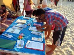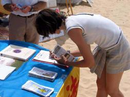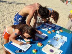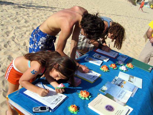 几百名游人在呼吁制止迫害法轮功的请愿书上签了名。学员们还向游人们教授了法轮功的五套功法,并教他们制作纸莲花。由于太多人要参加这些活动,学员们的摊位一直开到夜晚。