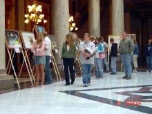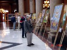 此次画展是在印第安纳的州政府大楼里举办,为期一周。虽然不是周末,但每天都有很多前来参观的人,有中学生、小学生,教师,艺术工作者,残疾人士,还有不少政府大楼里面的工作人员。这一幅幅讲述着“真、善、忍”的画已经深深感染了人们的心,画里表现出的法轮功学员面对残酷迫害而坚忍不屈的精神也极大的震撼了每个参观者。