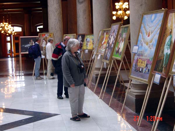 画展第一天,一群中学生在老师的带领下来州政府大楼参观。他们本不知道这里有画展,所以当他们看到这个画展时,真是喜出望外,原来他们就是在上美术课。于是老师带着学生们认真观赏每一幅画,教他们画面是如何表现正与邪恶,好和坏的,包括色彩的运用和人物表情的处理。师生都表示这个画展简直是为他们准备的一样,他们就是在找这样的题材。他们临走时还特意过来和学员交谈,拿了所有的法轮大法真象材料。特别是:当得知画展只有一周的展期后,这个老师说她一定要将画展的消息告诉其他老师。果真,两天后他们同一学校的老师也带着学生来了,就是那位美术老师告诉他们的这个好消息。