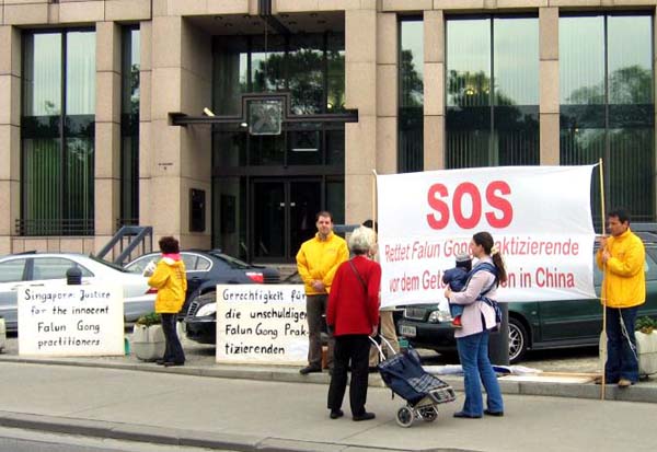 新加坡驻维也纳使馆位于银行大厦,地处交通要道。所有过往车辆在红灯时恰好都停在学员们所打的横幅之前。几百位司机欣然接受了关于新加坡事件的介绍及法轮大法真象材料。