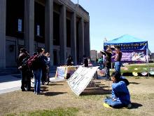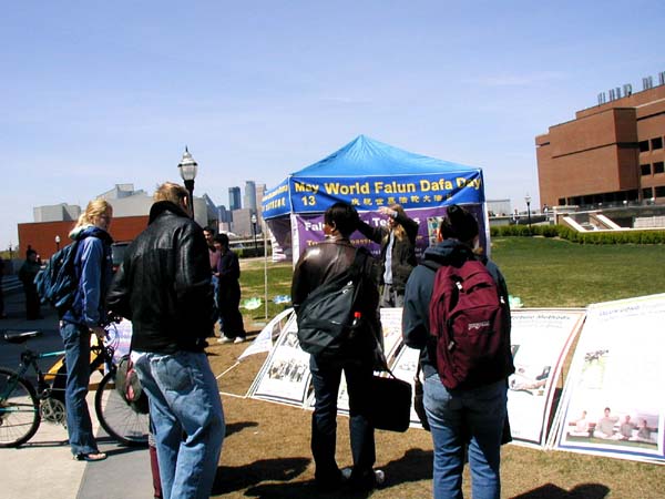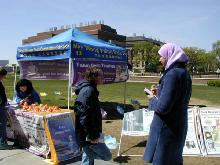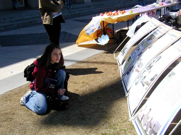 一位女学生看到了法轮功展位十分高兴,她说早就想试试法轮功,可一直没有机会。还有一位男学生听了真象后说,我今天了解了太多的东西,没想到中国执政者和过去一样残酷。也有学生表示在纽约曾看到法轮功学员的酷刑模拟展示;他说,真是太残酷了,难以想象。