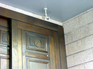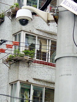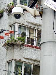 ![]() 这个装在屋檐下的探头正对着上海永嘉路 | ![]() 上海斜土街道12只路面监控探头的控制室就在这幢楼里 |