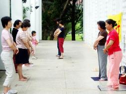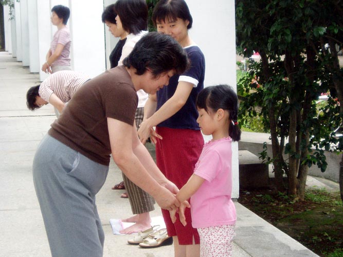 ![]() 小妹妹跟妈妈来学功才第二天就有模有样了 | ![]() 社团活动开放,一位大姐很喜欢来这里炼功 |