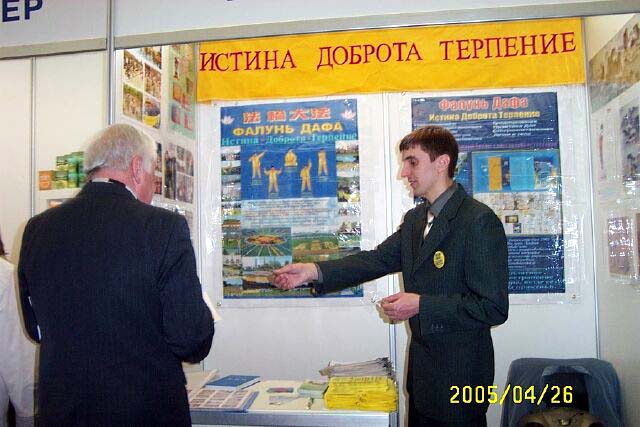 这次“莫斯科—健康城市”博览会短短两天,却使很多人了解了法轮大法。到这里参观的有不少专家学者、医生、军官等各界人士,也有很多市民,大家都从不同角度想了解法轮大法,几乎人人都主动索取简介和真象资料,光盘、书签、贺卡和纸莲花备受欢迎。有的人听完学员介绍或看了五套功法演示当场表示要学功,不少人记下了炼功点的地址。也有人提出不解的问题,如:这么好的功法中共为什么要迫害?当学员告诉他,因为中共的本质是邪恶的,它鼓吹的是无神论,信的是假恶斗,所以从根子上它就是反对真善忍的,人们听后纷纷点头认可。