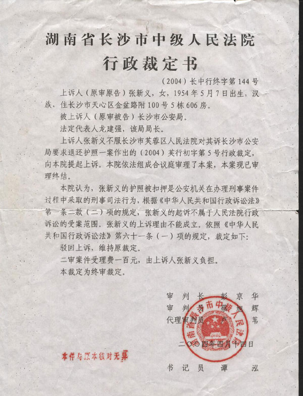 张新义要求长沙市公安局归还护照、并诉诸法院,却遭法院以“非行政审判权限范围”为由驳回。