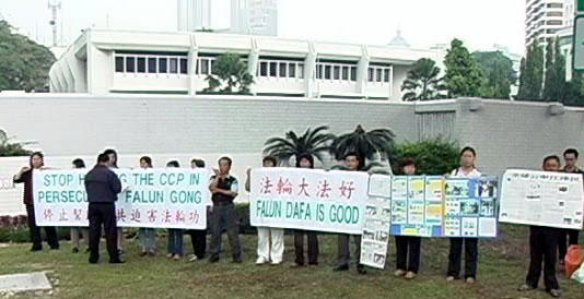 ![]() 马来西亚学员向新加坡最高专员署递请愿信 | ![]() 马来西亚学员在新加坡最高专员署外召开记者会 |