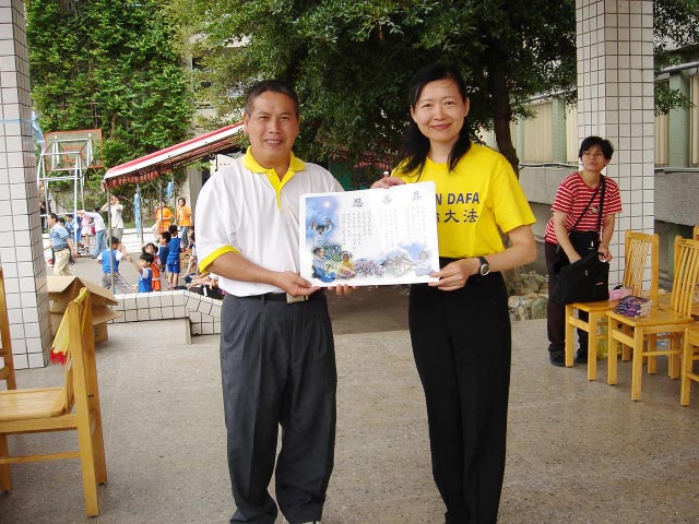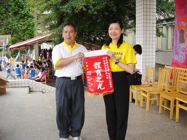 学员们热心的积极参与,表演中,校长和家长会会长也跟着学炼功法,表演结束后校方颁发一面锦旗给法轮功团体,而同修也回赠真善忍海报给校方,热闹的校庆在气氛欢愉中顺利落幕,将法轮大法的美好带给了学校。