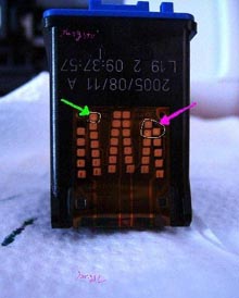 2. 用另一透明胶贴住最右边的第3个点装入,再自检,提示墨盒出错,再将其拿出。(刷816时第二步屏蔽右边第二列第一个触点)