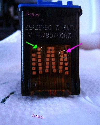 1、灌好墨后,用小块透明胶贴住左第二列的第一个点(触点面朝自己,最上为第一点)装入,自检完成后,可能会提示墨盒出错,再将其拿出。