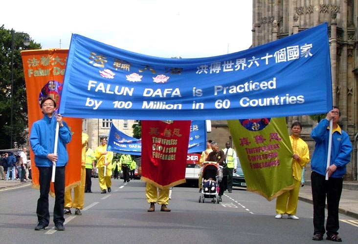 庆典游行于中午时分开始,整个游行队伍浩浩荡荡的穿过牛津城的市中心,途中经过了繁华热闹的步行商业街和牛津市政厅。热闹的游行队伍中,别具东方风采的法轮功团队颇为引人注目。法轮功队伍由手持“真、善、忍”三个大字的小弟子们领队,紧随的是“法轮大法好”的横幅。其后是两只雄风奕奕的狮子表演舞狮,然后是具有中华传统民俗色彩的腰鼓队及绸扇舞队,“世界需要‘真、善、忍’”和“法轮大法洪传全世界六十多个国家”的中英文横幅,以及色彩鲜艳的法轮旗,穿插在队伍中,颇显气势。舞绸扇的学员们随着“法轮大法好”的歌声翩翩起舞--“法轮大法好,法轮大法好,法轮大法是正法,佛光普照。”优美的歌声回响在牛津古城的街道上,也将大法弟子的心声传送给了牛津市民和远道而来的游客。精神抖擞的腰鼓队,温文尔雅的绸扇舞,凛凛正气的法轮大法横幅,法轮功学员的精神风貌给沿途观众留下了深刻的印象。队伍所过处,不时有阵阵掌声响起。