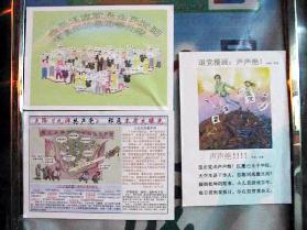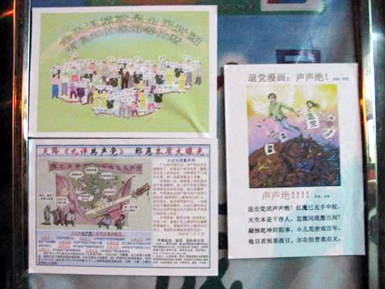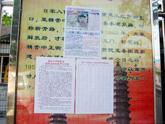 2005年6月4日,太原主要街道之一五一路上,出现了张贴的“·九·评*”、三:退.宣传画和三:退.声明。