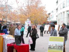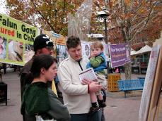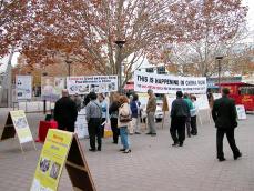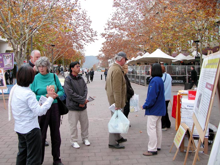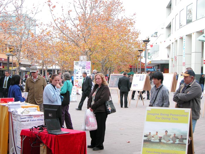 上午11点,法轮功学员的展览还没有摆好,就有人等着观看,想了解法轮功及其受迫害的情况,并签名支持反迫害。有的人还特别希望了解法轮功学员在澳洲所受中共骚扰、迫害的情况,并表示要求澳洲政府调查和采取行动制止中共的非法行为。