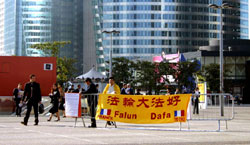 这里法国和世界级的大公司很多,上下班高峰期间和午餐时间白领阶层人潮如流。尽管他们步履匆匆,但法轮功学员的横幅和展板吸引了他们的视线。很多人接传单,有的边走边看起来,有的向学员询问详情,有的签名表示支持法轮功学员、反对迫害。