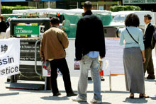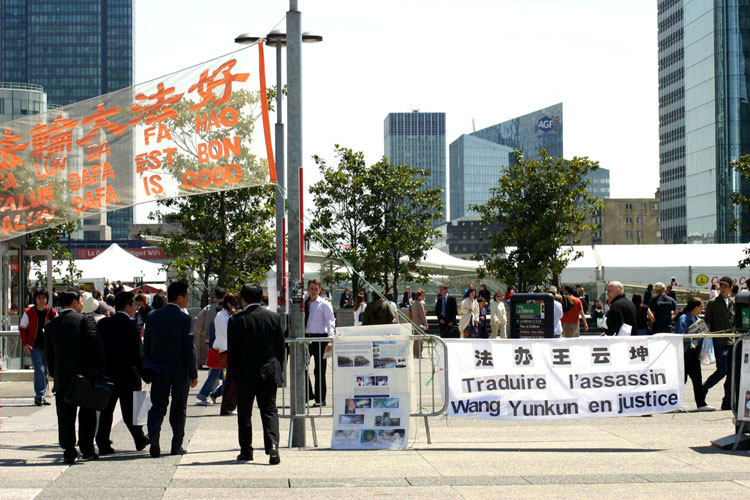 中午时分,一个参加汽车工业大会的法国人兴冲冲的走到信息桌前,他说他早晨拿了传单和起诉王云坤的新闻公告,他觉得应该让更多的法国同事知道,于是拿了几张放到大会的咖啡厅里。学员同时请他转告王云坤:如果他还不明白法轮功,请他到法轮功的网站上去了解。如果他知道法轮功是什么,叫他不要继续迫害法轮功了。他连连点头答应了。真是个明白人。