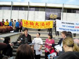 纽省法轮大法发言人鲁巴西科首先介绍说,澳大利亚外长亚历山大•唐纳是在2002年3月中国外长唐家璇到访堪培拉之前第一次签署这个行政令,不允许法轮功学员在堪培拉中国大使馆外100米之内展示横幅和播放音乐。澳大利亚联邦警察执行外交部长唐纳的命令,从中国大使馆前面强行撤除已有九个月历史的法轮功学员抗议中共迫害的横幅和扩音设备。