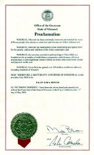 鉴此,我,麦特-布朗特,密苏里州州长,特此褒奖2005年5月为密苏里州“法轮大法月”。