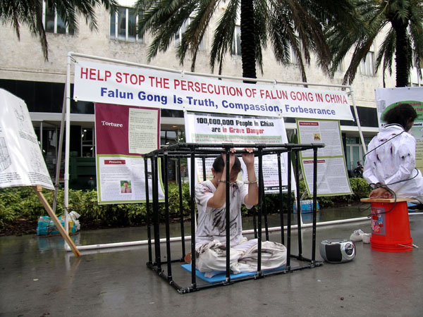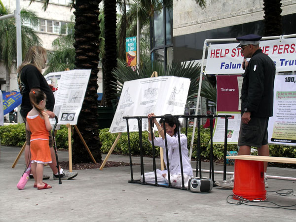 这是佛州学员第一次在迈阿密办酷刑展,没有经验。在布置真象材料和搭设展板时,学员们发挥各自的智慧,配合默契。从法轮大法的洪传图片,到优美的功法展示;从派发真象传单,到征集反迫害营救孤儿签名;从酷刑图片,播放讲解录音,到真人模拟酷刑,一切都是那么有序合理。