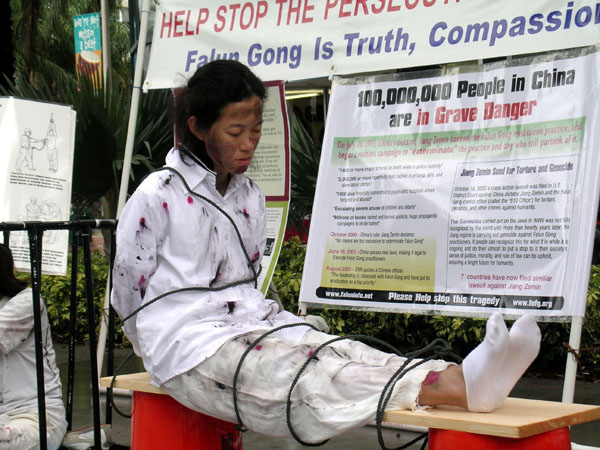 ![]() 模拟酷刑展示 | ![]() 模拟酷刑展示 | ![]() 观看真象展板的父女 |