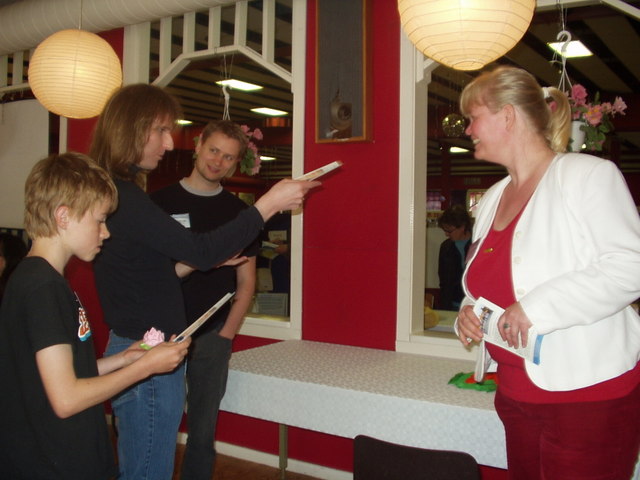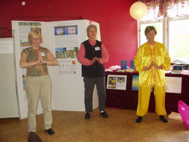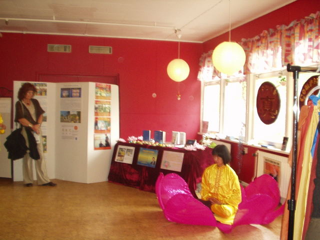 许多人高兴的收下学员们手工制的纸莲花,孩子们都快乐的学习折纸莲花的方法,而且值得一提的是,有些孩子因此而安静下来。有很多人驻足观看学员们展示功法,其中有一位参展者表示,她感到法轮功学员的展位散发强烈的能量场,而且在学员们展示功法时她也能感受到强烈的能量。