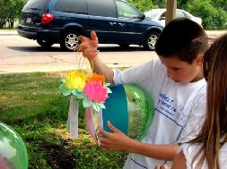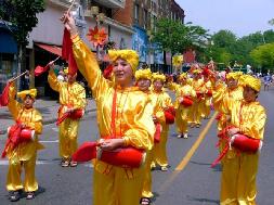 ![]() 法轮功学员的游行队伍 | ![]() 法轮功队伍受到观众欢迎 |