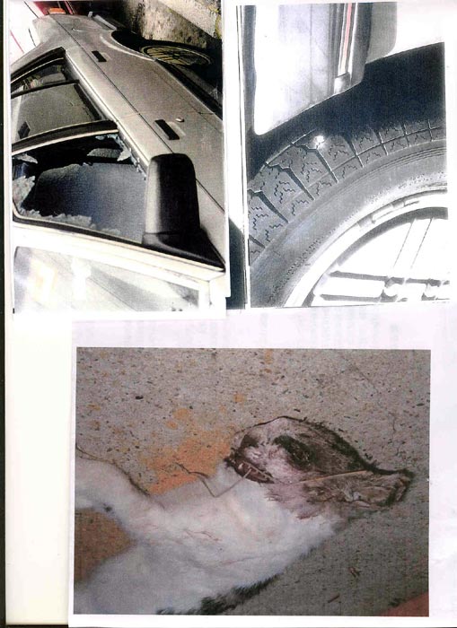 1999年7月至12月我在中国驻悉尼领馆前抗议时,车轮多次被扎,钉大帽钉,车窗被砸。因我在澳洲纽省高院起诉江泽民和610办公室,今年2月,有人把一只血淋淋的死猫放在我家门口,小猫的鲜血渗透在地上,直至现在血迹仍然无法洗去。每天看到这一滩血迹都会感到恶心,我女儿更是害怕。