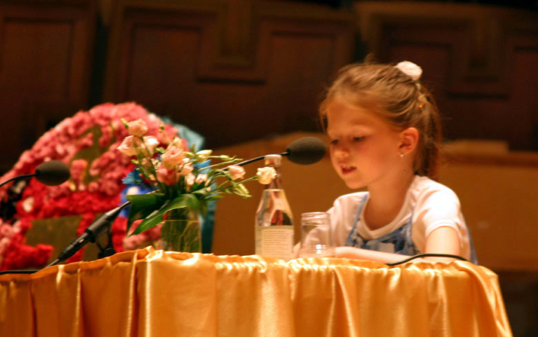 年仅7岁的瑞士小弟子卡达林娜(Katharina)谈了她作为小弟子做好三件事的体会。她在发言中提到:“每当我在外打坐炼功时总是把一张小展板放在我身边,许多过路人都来看。我非常高兴我能有这幅小展板。也许已经有许多人看到了我的小展板,我非常的愿意帮助他们。”