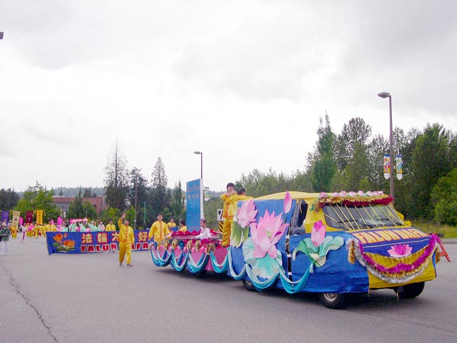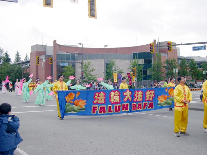 这是加拿大法轮功学员在继参加加拿大温哥华本那比市(Burnaby)的脱帽节游行和加拿大新西敏市(New Westminster)Hyack节后,再次参加的社区游行,把法轮大法的美好殊胜带给那里的人们。