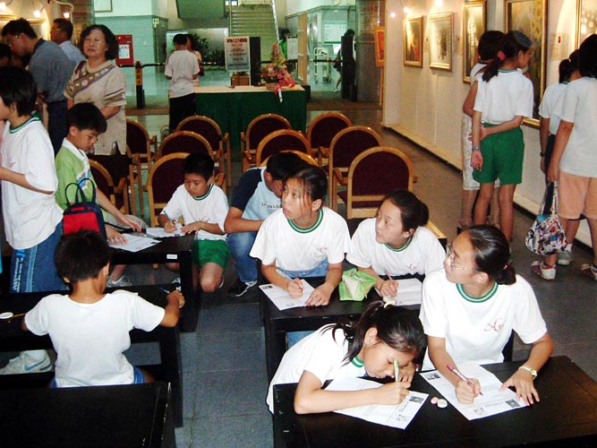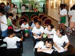在参观画展前,我事先将美展DM资料及校外参观通知单钉在学生的联络簿上,也顺道邀请家长一起参加。在参观的前一天,我先将美展画作及展出缘由用电脑介绍一遍给孩子了解,并发下和同修一起设计的美展学习单作讲解。参观当日并要求学生携带美展学习单及笔以利完成当日学习单作业。事实上通过美展DM、校外参观通知单的说明,并要求学习单完成后要让家长检阅签名,也起到让孩子对家长讲真象的效果。