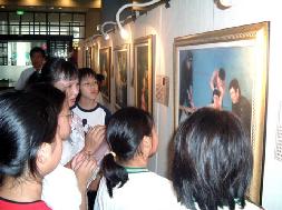![]() 小学生到画展现场参观并写心得 | ![]() 学生专注的听导览人员讲解 |