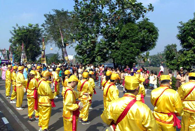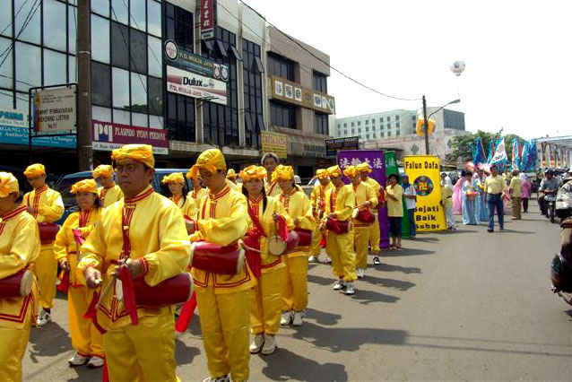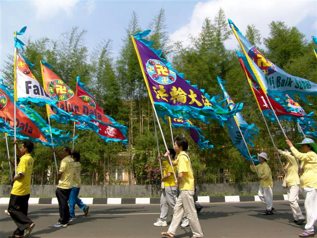 ![]() 法轮功旗帜 | ![]() 法轮功队伍在丹格朗小市镇游行 |